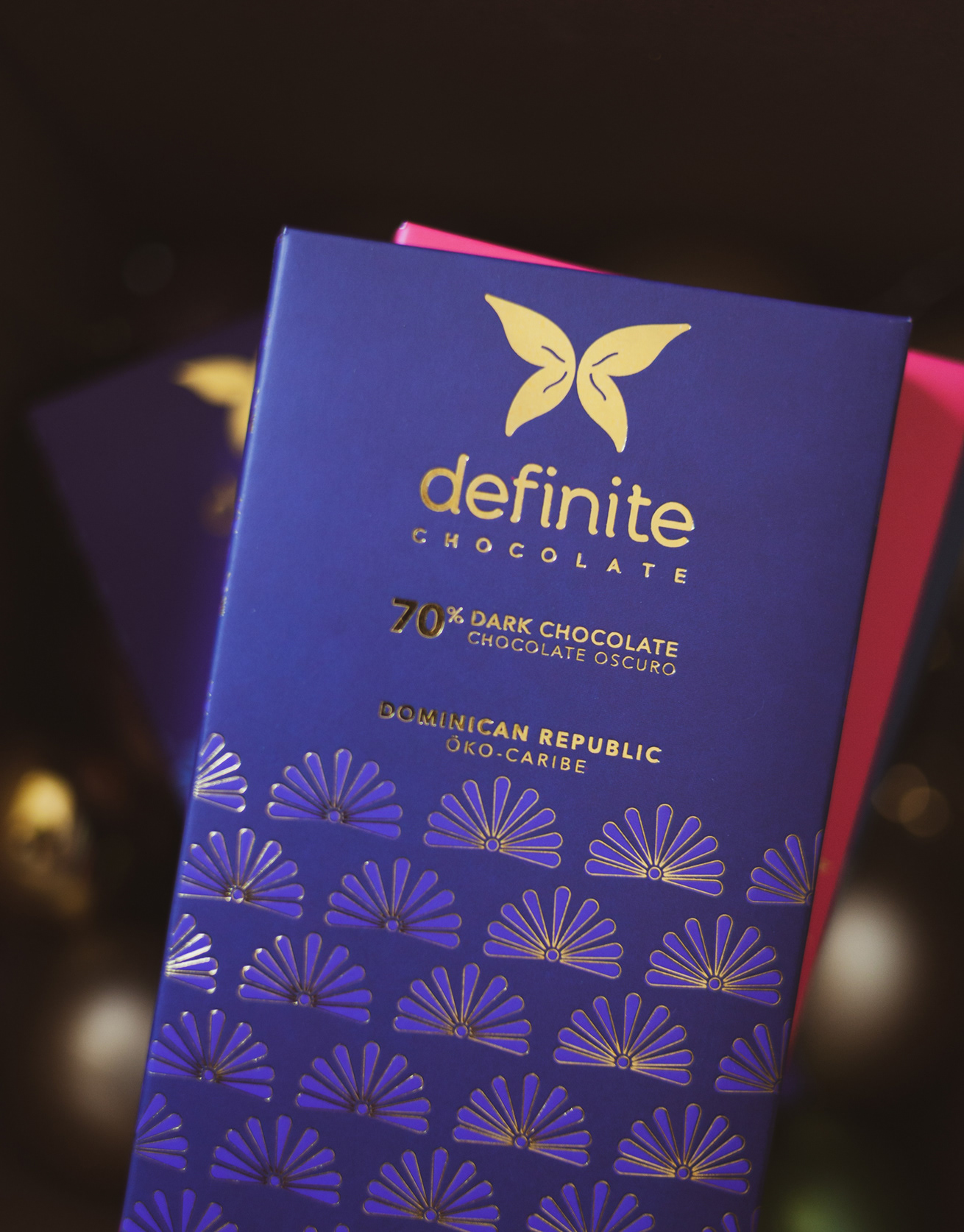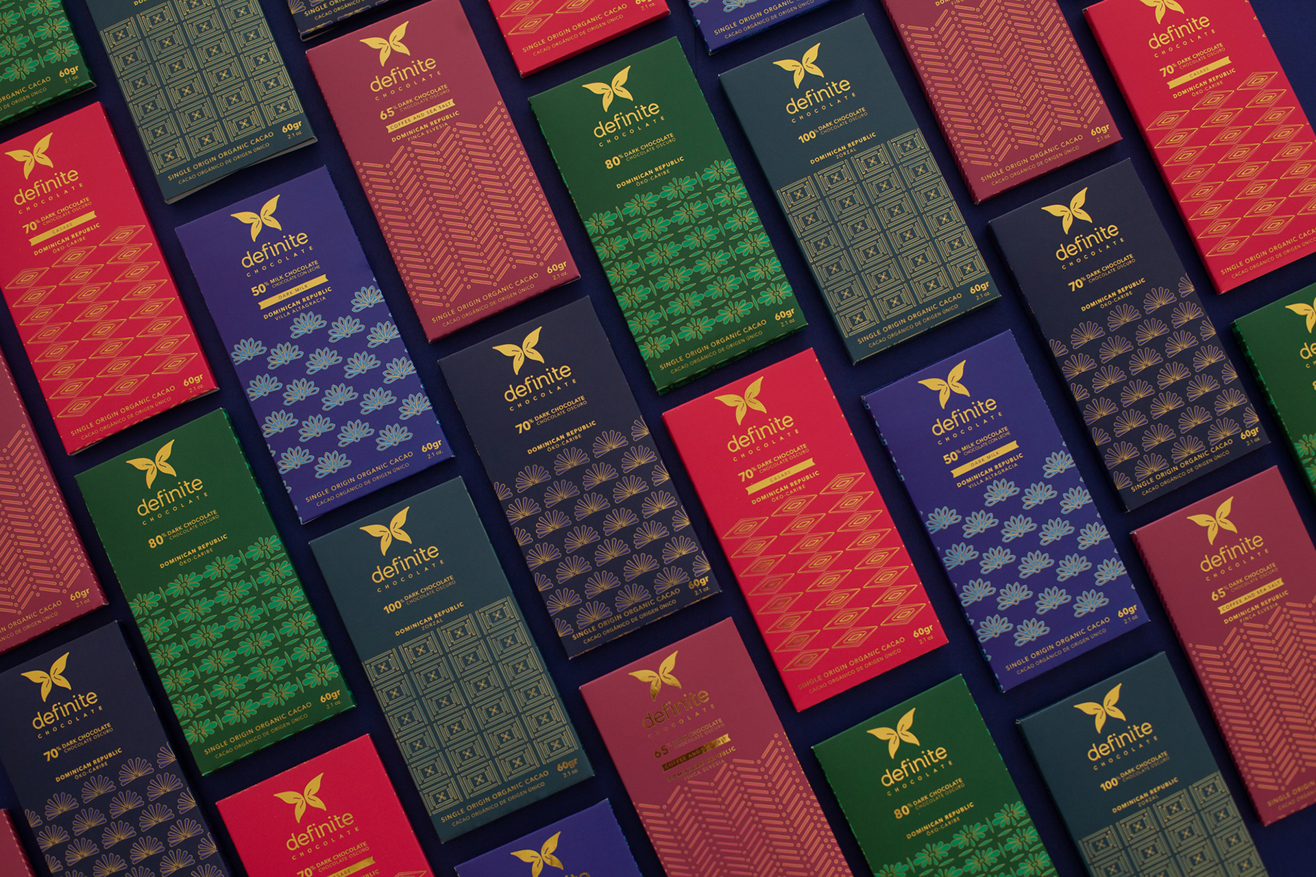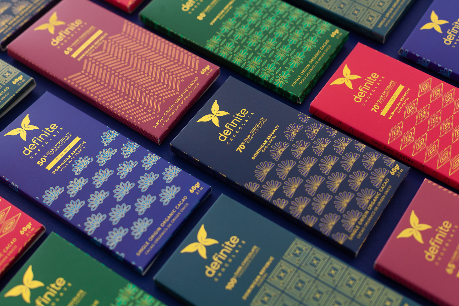 Branding, packaging design, and mould for Definite Chocolate, an artisan chocolate from the Dominican Republic.